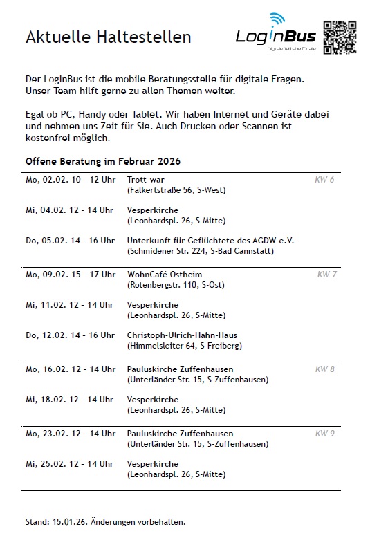 Während der Zeit der Vesperkirche (18.01.-07.03.) sind wir dort mittwochs vor Ort am Leonhardspl. 26, 70182 Stuttgart